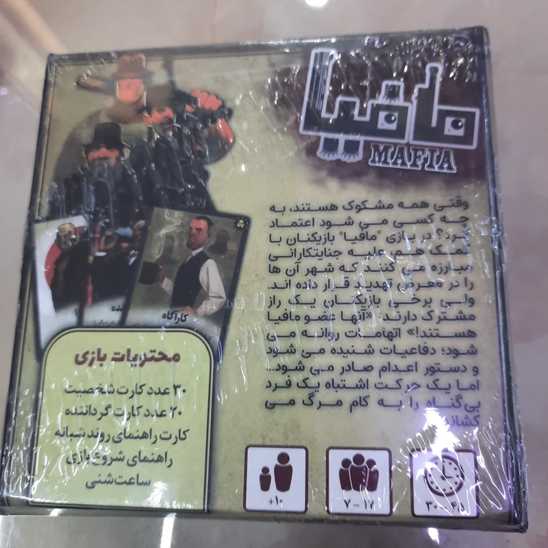 بازی مافیا بسیار جذاب و سر گرم کننده برای جمع خانوادگی ،مناسب ده سال به بالا ،تعداد بازیکنان بیو 7 تا 17 نفر محتویات : 30 کارت شخصیت 20 کارت گرداننده کارت راهنمای روند شبانه راهنمای شروع بازی