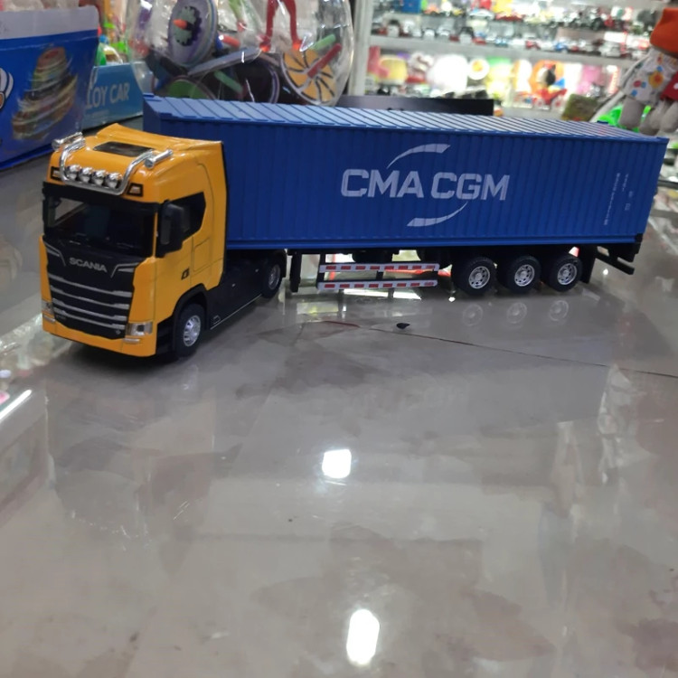 ماکت فلزی تریلی اسکانیا کانتینر دار ،موزیکال چراغدار جعبه دار رنگ زرد (1عدد)