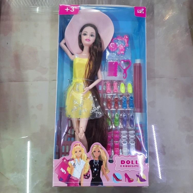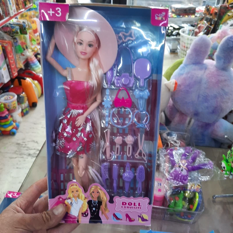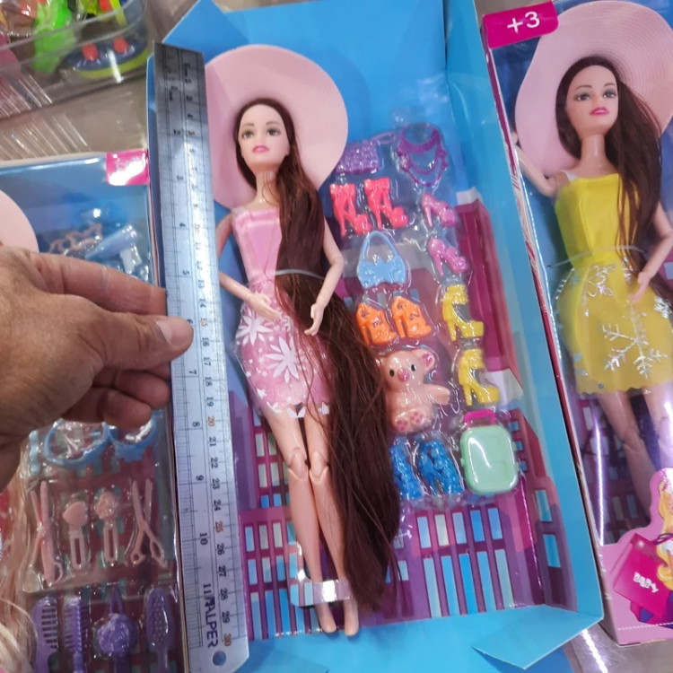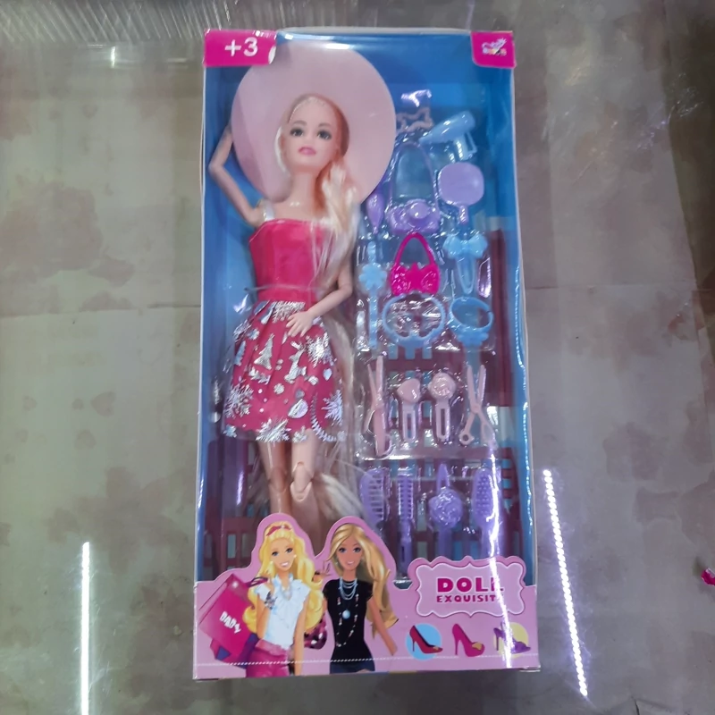 عروسک باربی تمام مفصل (غیر از مچ پا ) با وسایل اضافی شامل کفش و وسایل آرایشی جعبه دار با قد سی سانت ،موهای بلند . برای سنین سه سال به بالا ،محصولی از کشور چین
