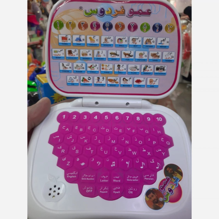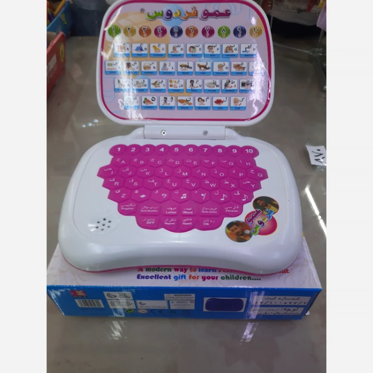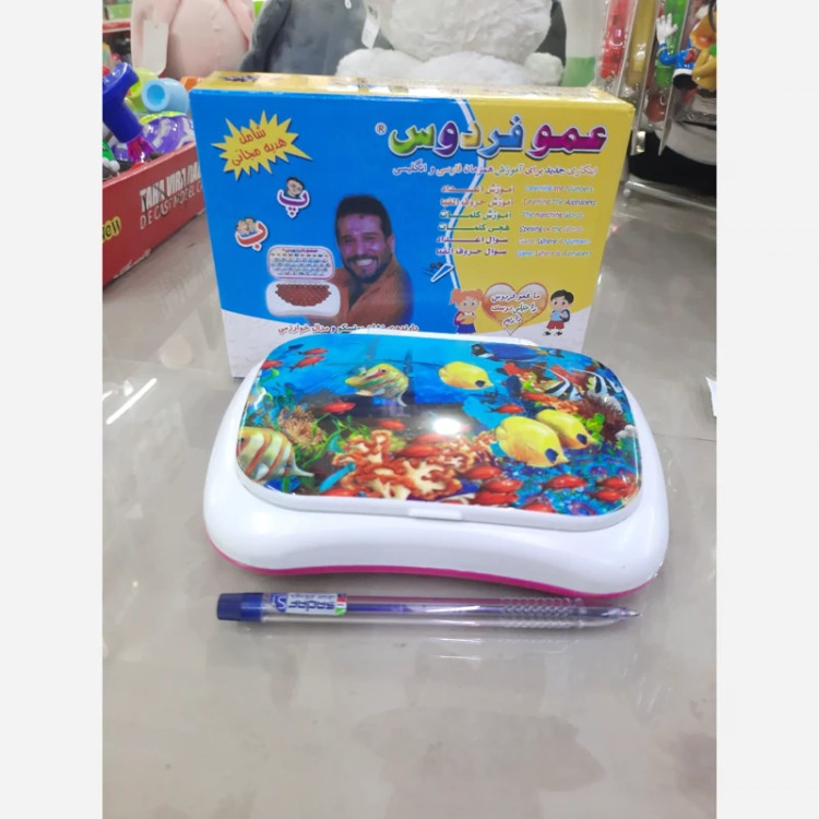 اسباب بازی لپ تاپ آموزشی عمو فردوس ابتکاری جدید برای آموزش همزمان فارسی و انگلیسی اعداد حروف الفبا کلمات و،،، تک جعبه دارنده نشان یونسکو و مدال خوارزمی مناسب کودکان بالای سه سال اندازه 23×17سانتیمتر