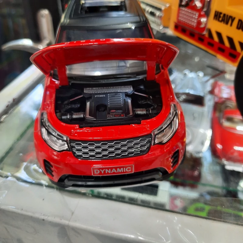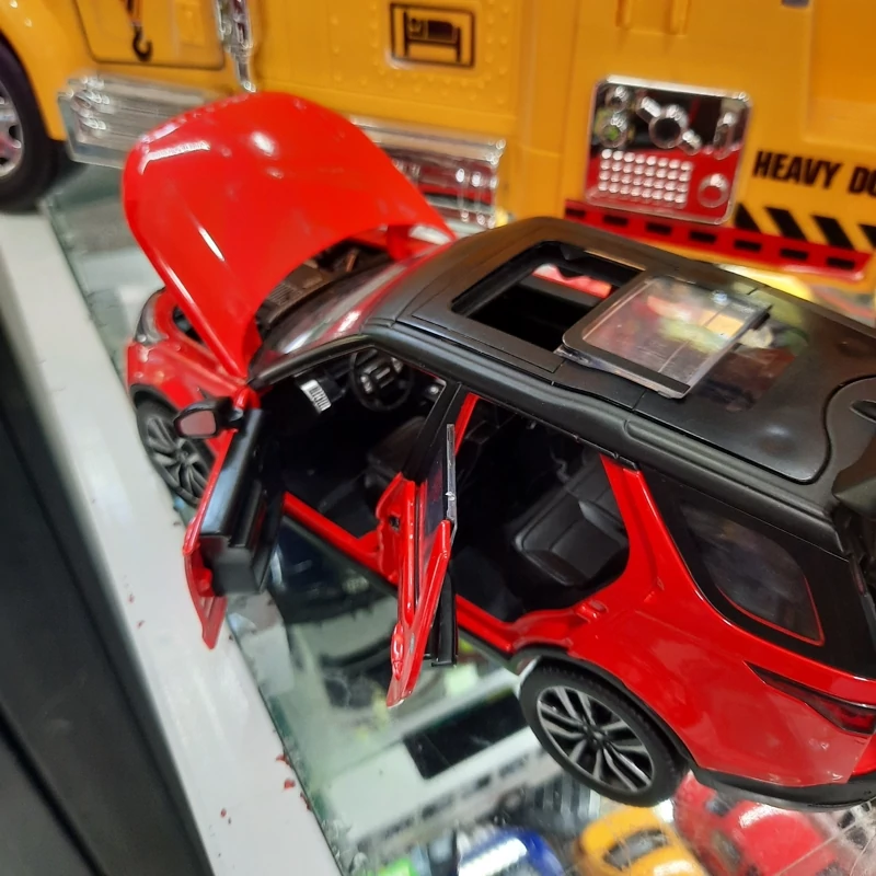 ماکت فلزی رنجرور موزیکال چراغدار سایز 1/24 شش در باز شو، عقب کش ،آینه تا شو سقف بازشو رنگ قرمز خوش رنگ
